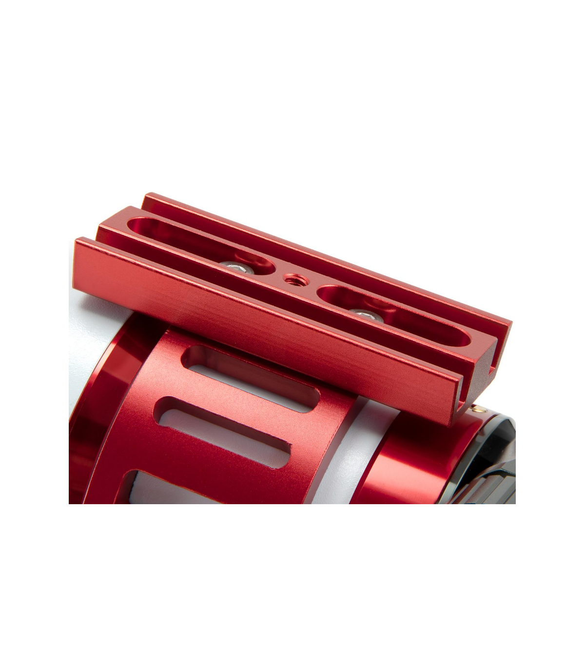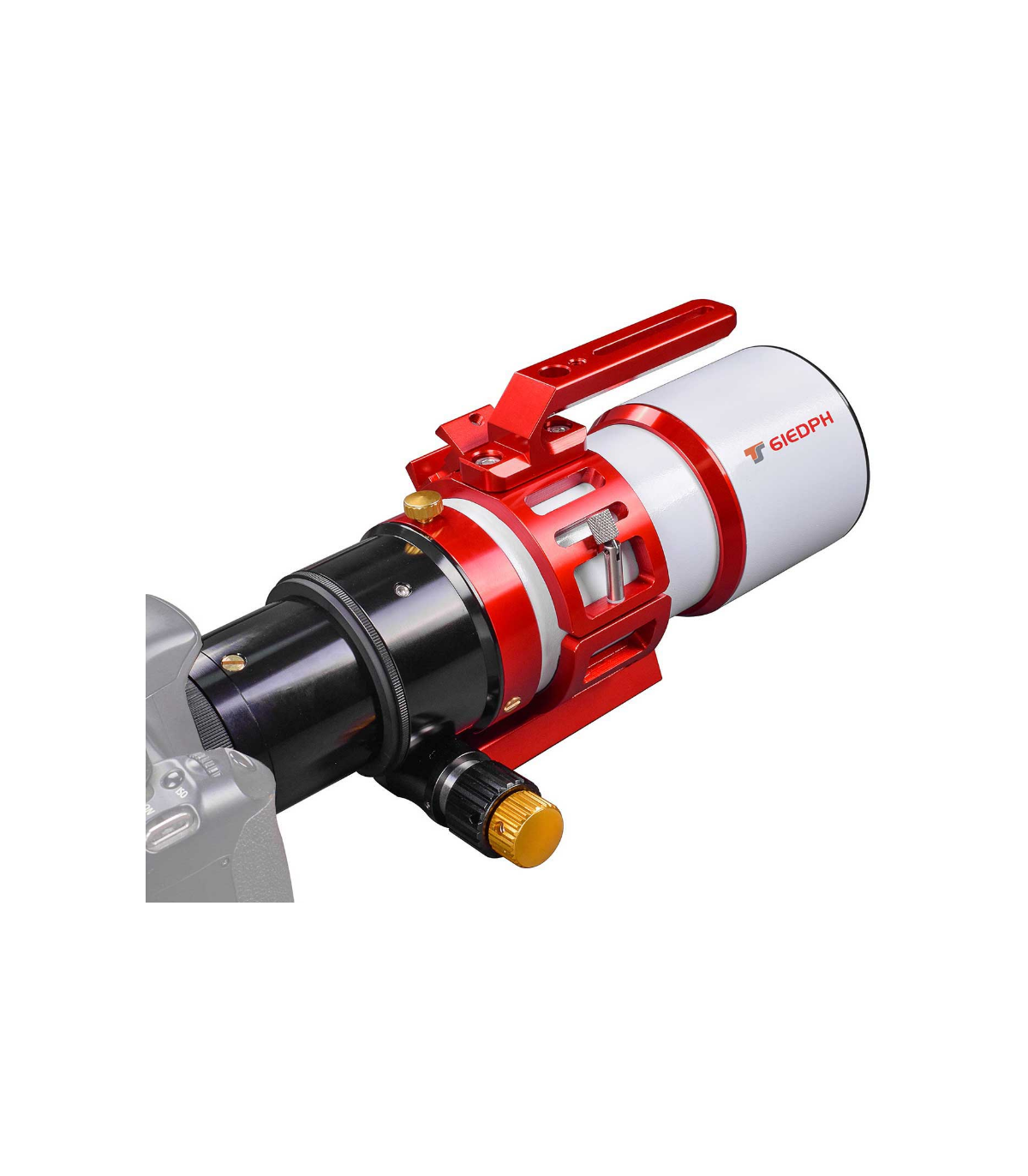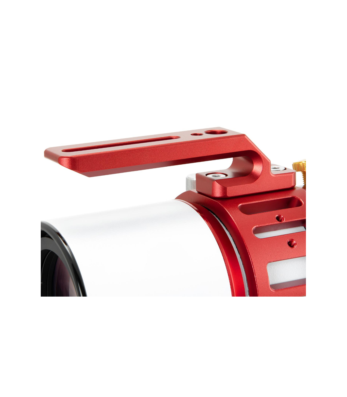 La abrazadera CNC tiene una barra de cola de milano estilo GP y EQ5 en la base. Puede acoplar el telescopio a los soportes de desconexión rápida y soportes de viaje adecuados, como el Skywatcher Star Adventurer. Las abrazaderas de cola de milano a juego se pueden encontrar en la sección de accesorios. Además, el riel también tiene una rosca para trípode fotográfico de 1/4". Por lo tanto, el Apo encaja directamente en cualquier trípode fotográfico, como un teleobjetivo.