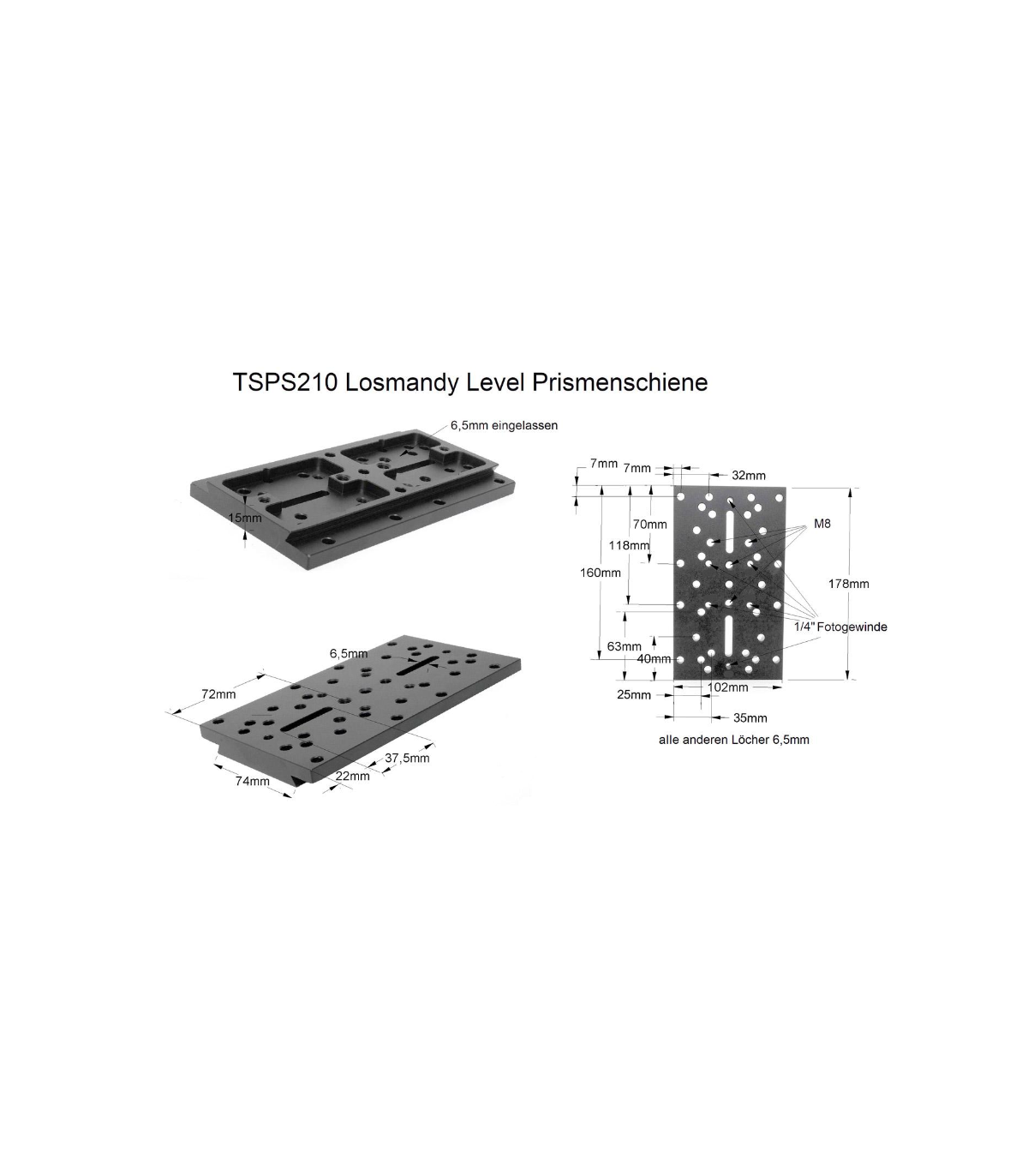 | Counter sunk holes for 1/4" and M6 screws: | Distance 32 mm, 38 mm, 51 mm, 50 mm, 60 mm, 89 mm (to the long center axis) |