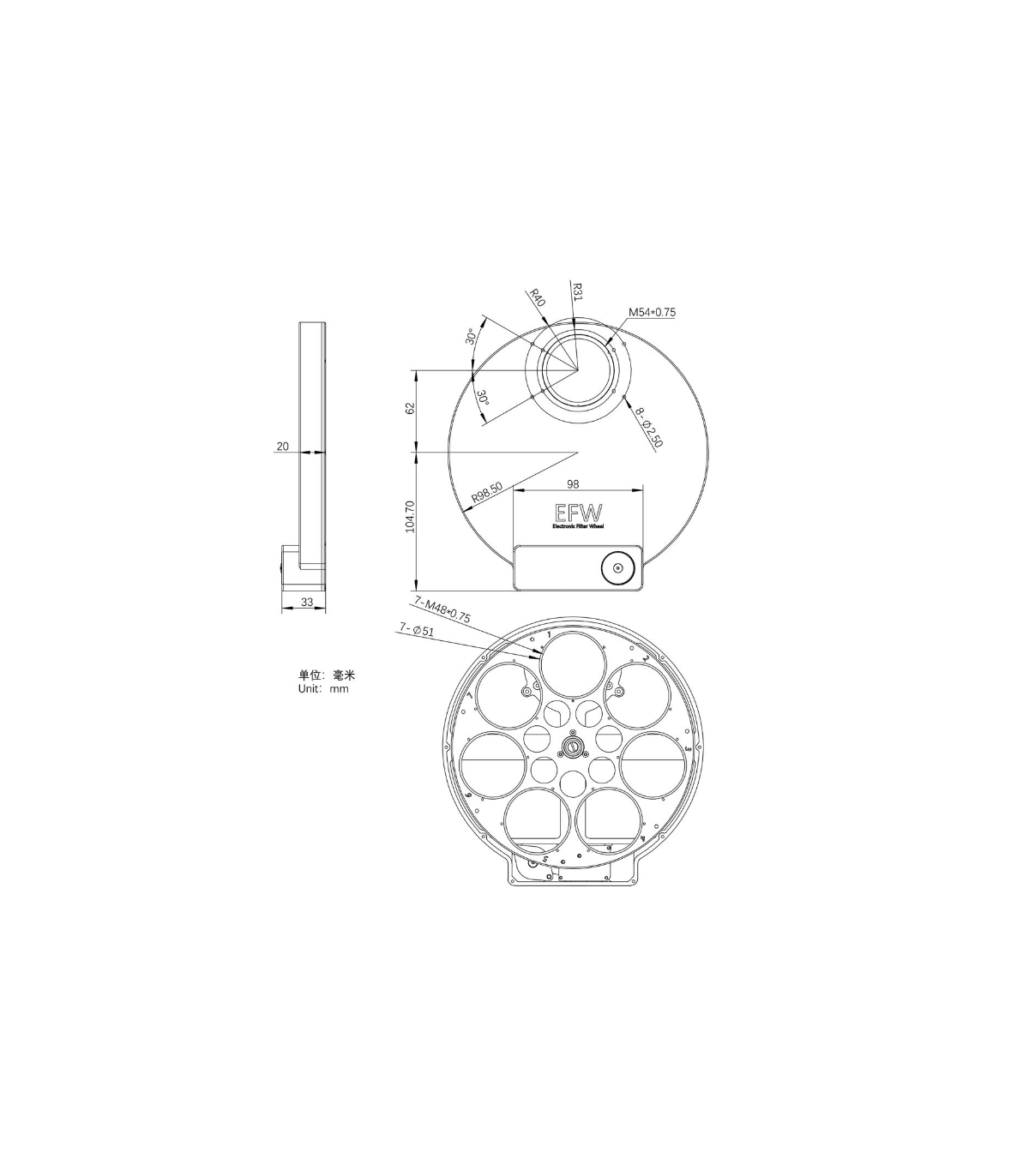 The filter wheel housing is CNC machined from a block of aircraft grade aluminum. It is characterized by excellent workmanship, it is very thin and light with a thickness of only 20mm.