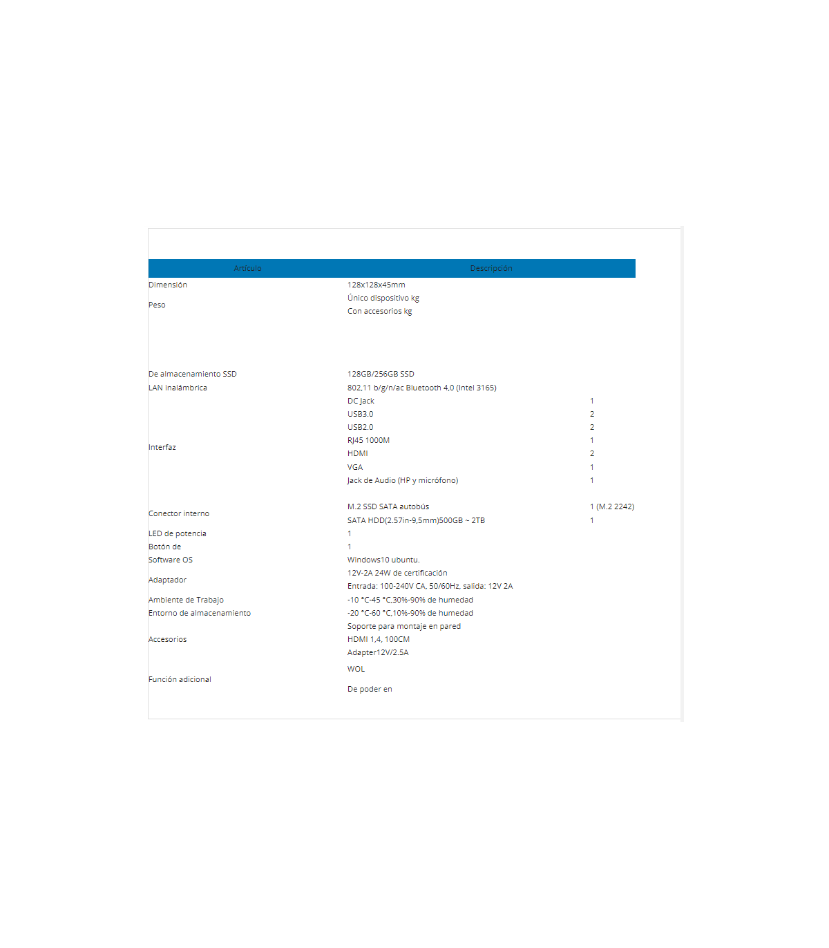 The mini pc includes the computer, power supply, 1 meter hdmi cable and support for wall anchoring.
